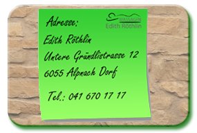 In Alpnach Dorf an der Unteren Gründlistrasse 12 finden Sie eine kleine Oase der Ruhe, spezialisiert auf Massagen, Entspannung, einfühlsame Behandlungen und professionelle Massagepraktiken. Im stilvollen Ambiente können Sie sich fallen lassen und finden Ruhe für Körper, Geist und Seele.
